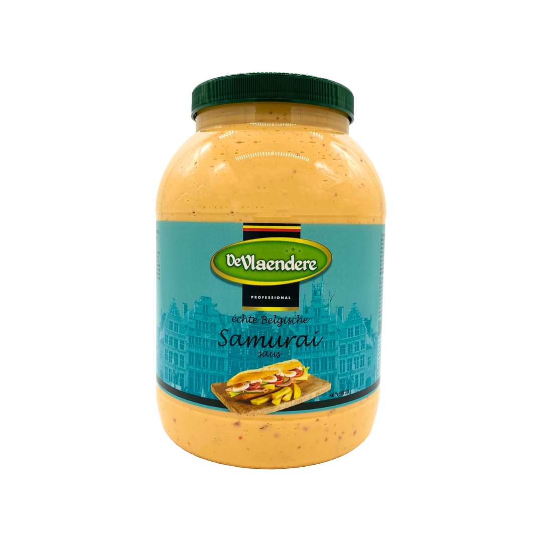 Cremig, pikant und typisch belgisch – die Samurai Sauce von De Vlaendere kombiniert feine Mayonnaise mit würzigem Sambal Oelek. Der ideale Begleiter für Pommes, Frikandellen oder gegrilltes Fleisch – mit authentischem Streetfood-Geschmack aus Belgien.